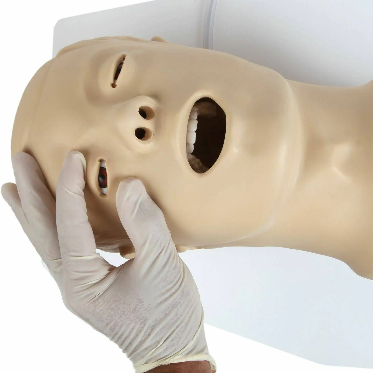 This manikin teaches standard posture and anatomy for airway intubation via oral and nasal passage, observation of pupils, manual carotid pulse and suctioning. Landmarks include nostrils, teeth, tongue, oral and nasal pharynx, larynx, epiglottis, arytenoids, trachea, esophagus, self-deflating lungs and stomach. Intubation is possible, as is suction, and Sellicks Maneuver. Manual carotid pulse is present, as are pupils for observation.